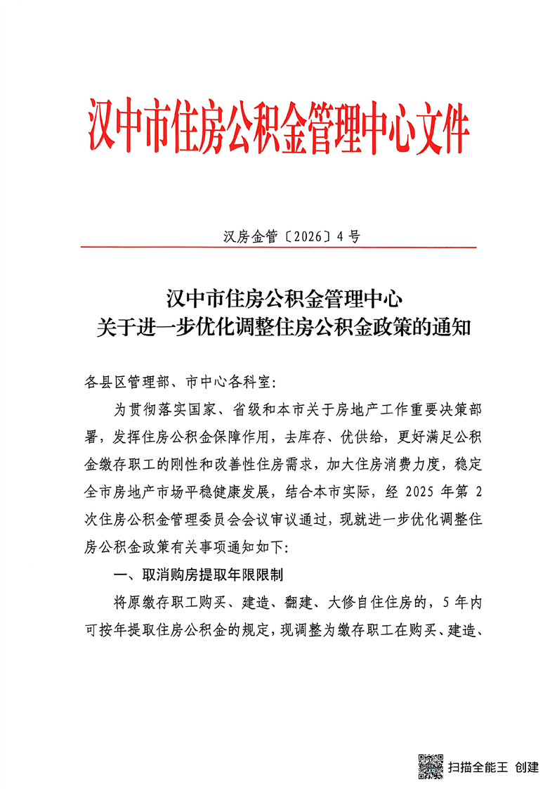 汉中市住房公积金管理中心关于进一步优化调整住房公积金政策的通知
